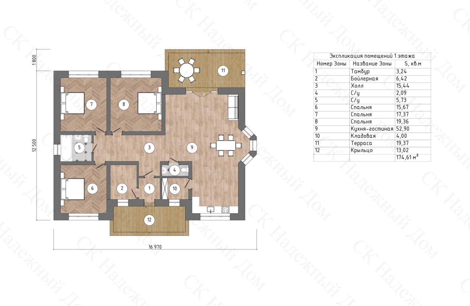 Зона ночного отдыха хозяев дома традиционно запроектирована на верхнем этаже. Её объём за счёт надстройки над террасой увеличен и позволяет расположить здесь две спальные комнаты. Их объединяет холл мансарды. Дополняет планировку этажа кладовая.