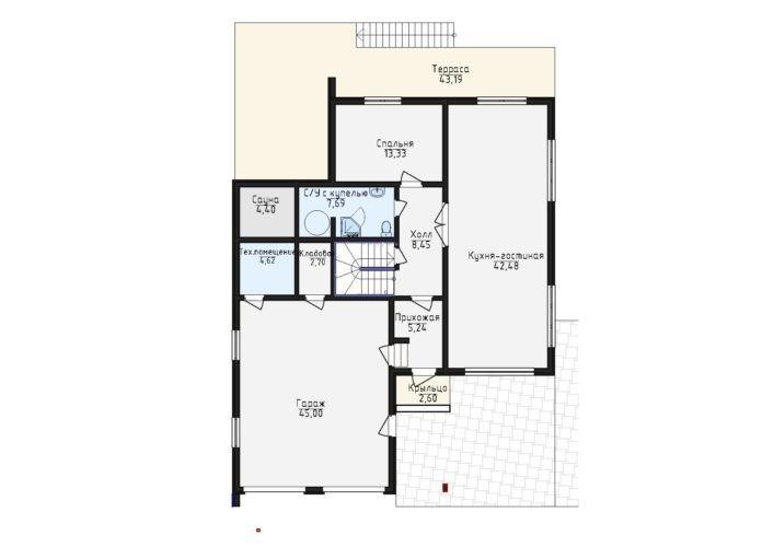 Проект дома Астра — очень рациональный дом, сочетающий удобство планировок и достаточно низкую цену. Терраса значительно увеличивает полезную площадь дома. Большая терраса и холл, являющийся в данном проекте и шлюзом, уменьшающим потери тепла дома, составляют зону входа.