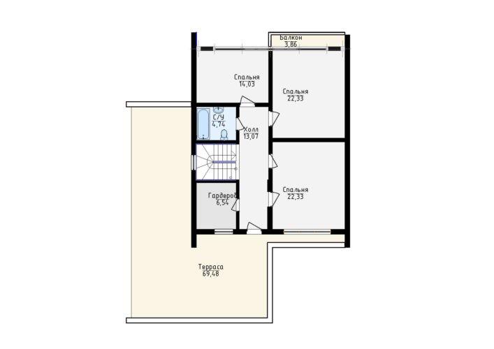 Зона ночного отдыха хозяев дома традиционно запроектирована на верхнем этаже. Её объём за счёт надстройки над террасой увеличен и позволяет расположить здесь две спальные комнаты. Их объединяет холл мансарды. Дополняет планировку этажа кладовая.