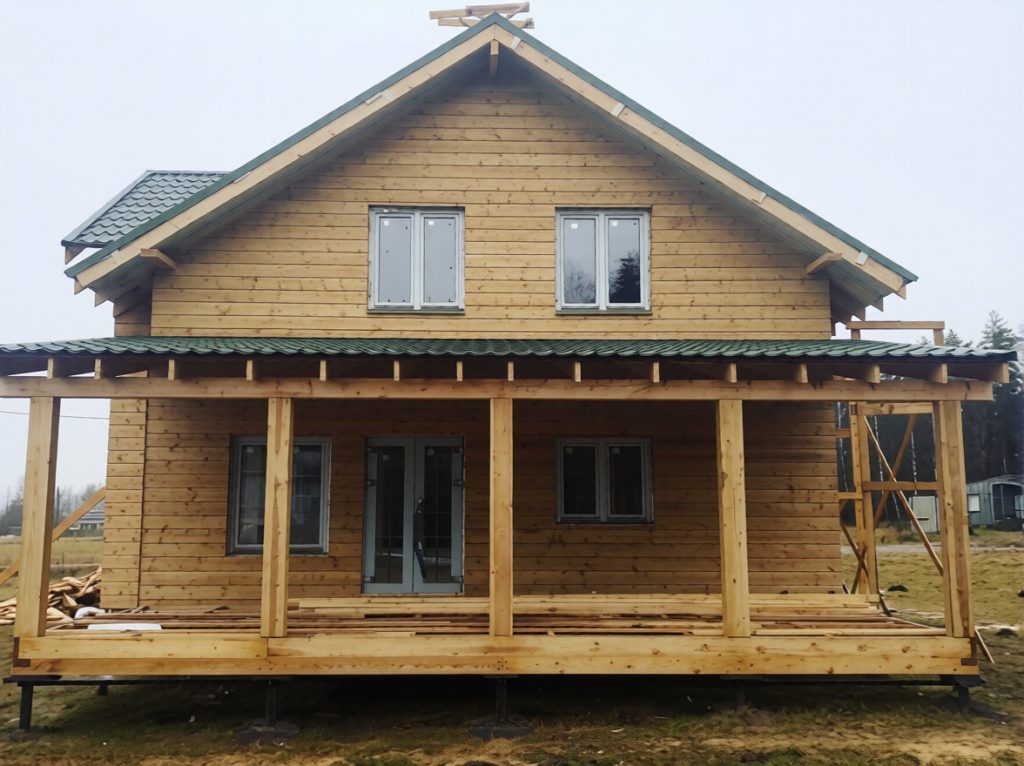 90 Срок строительства150 м² Общая площадь9 х 9 м РазмерыСтроительство каркасного дома с террасой в Петергофе
